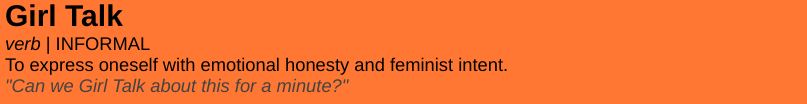 Girl Talk is built on trust. Trust us to have good faith in our platforming, our writing, and our events. We trust you to Talk with the aim of making the world a better place and expressing yourself with emotional honesty.